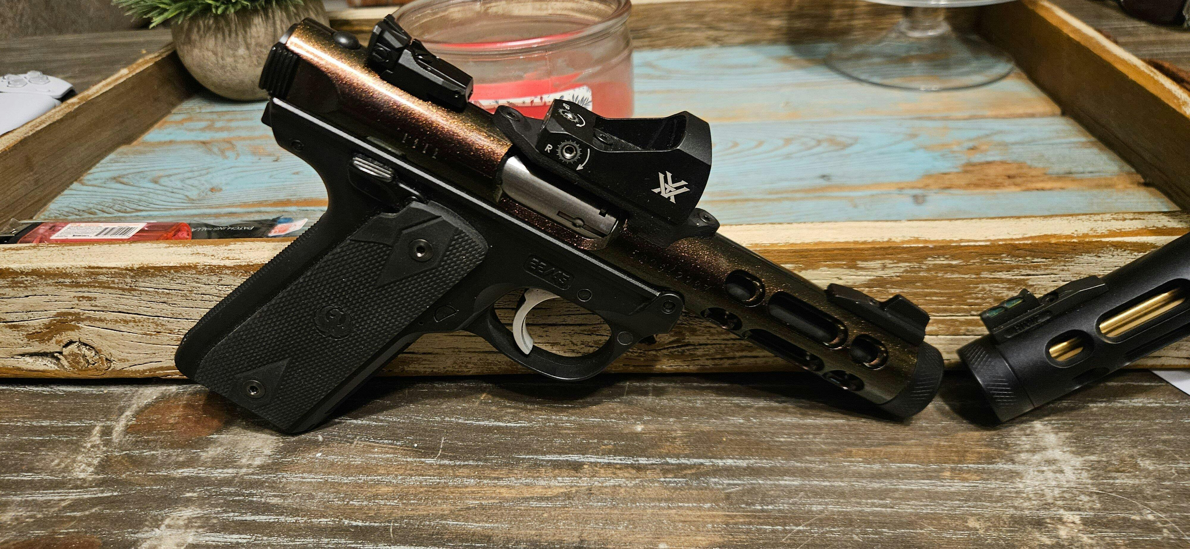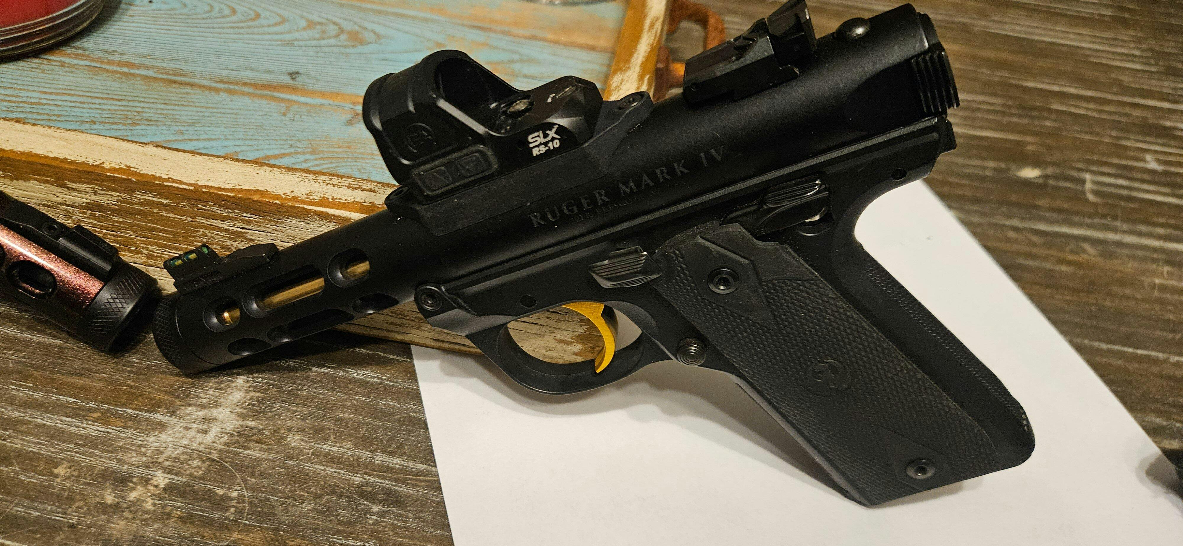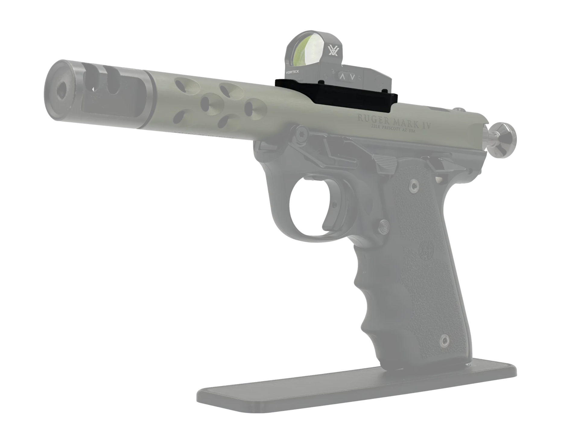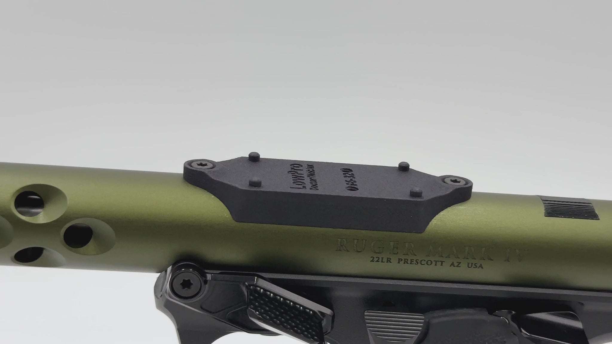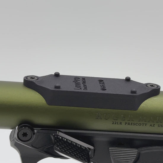 The LowPro™ Low-Profile Docter/Noblex Red Dot Mount for Ruger Mark I/II/III/IV pistols is an ultra-low-profile mounting plate for attaching a red dot with an Docter/Noblex footprint directly to the barrel of a Ruger Mark I/II/III/IV.