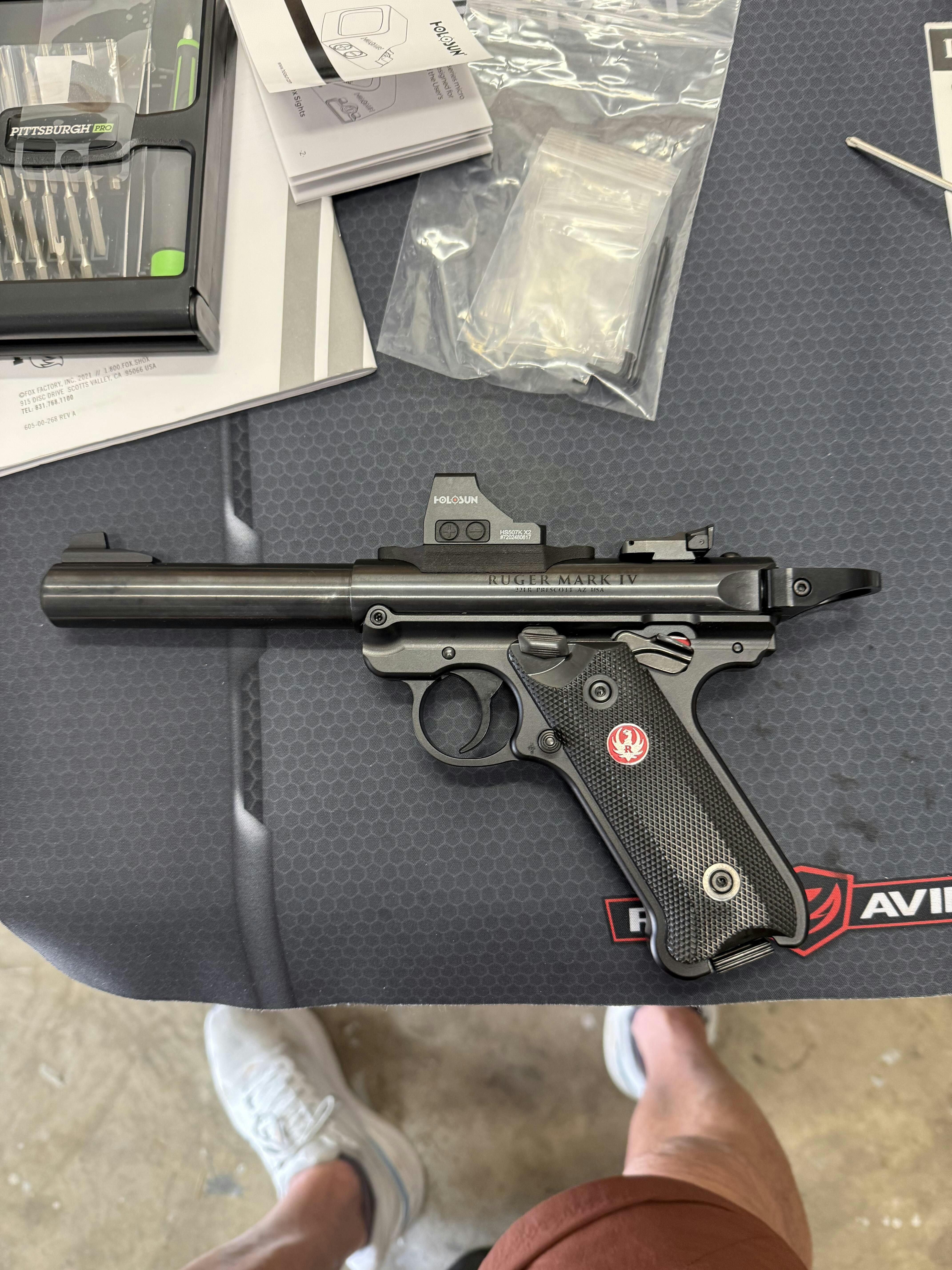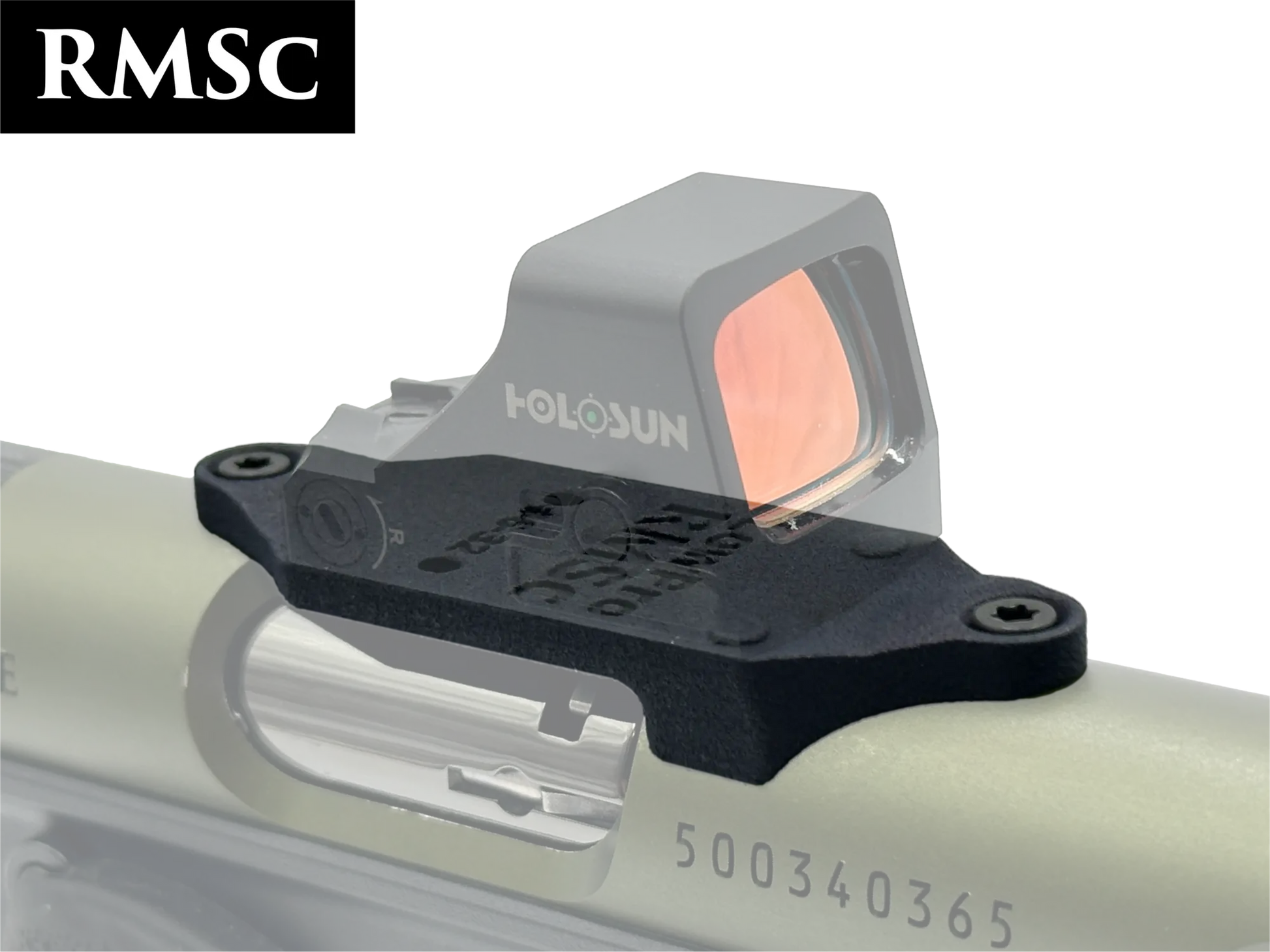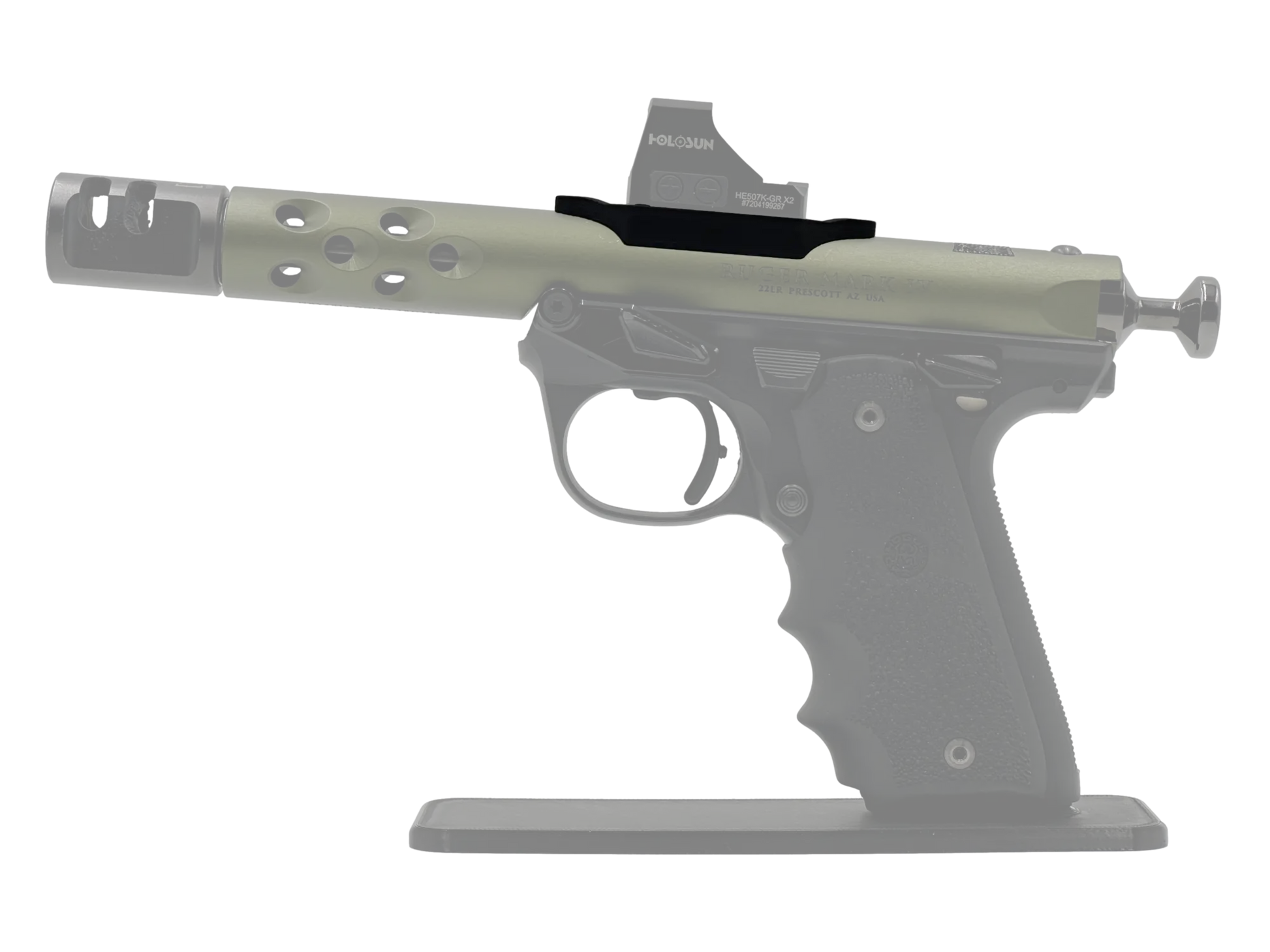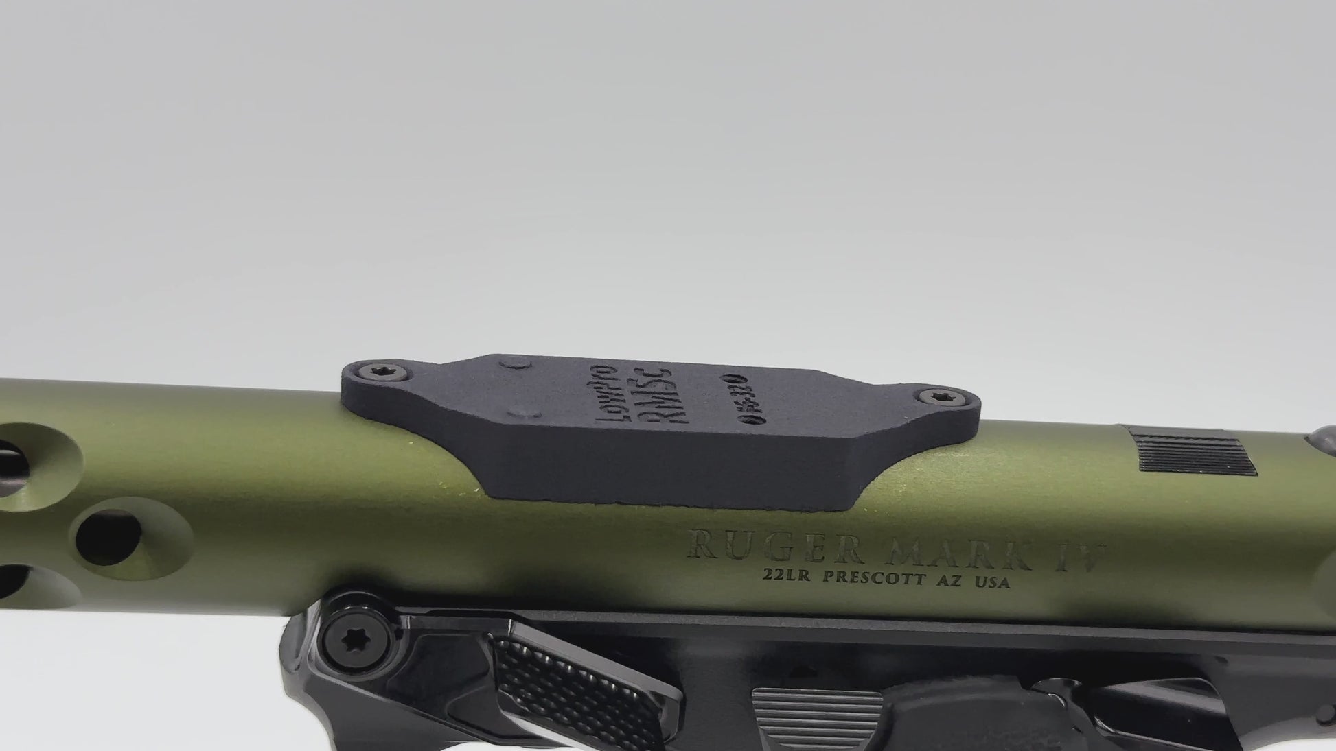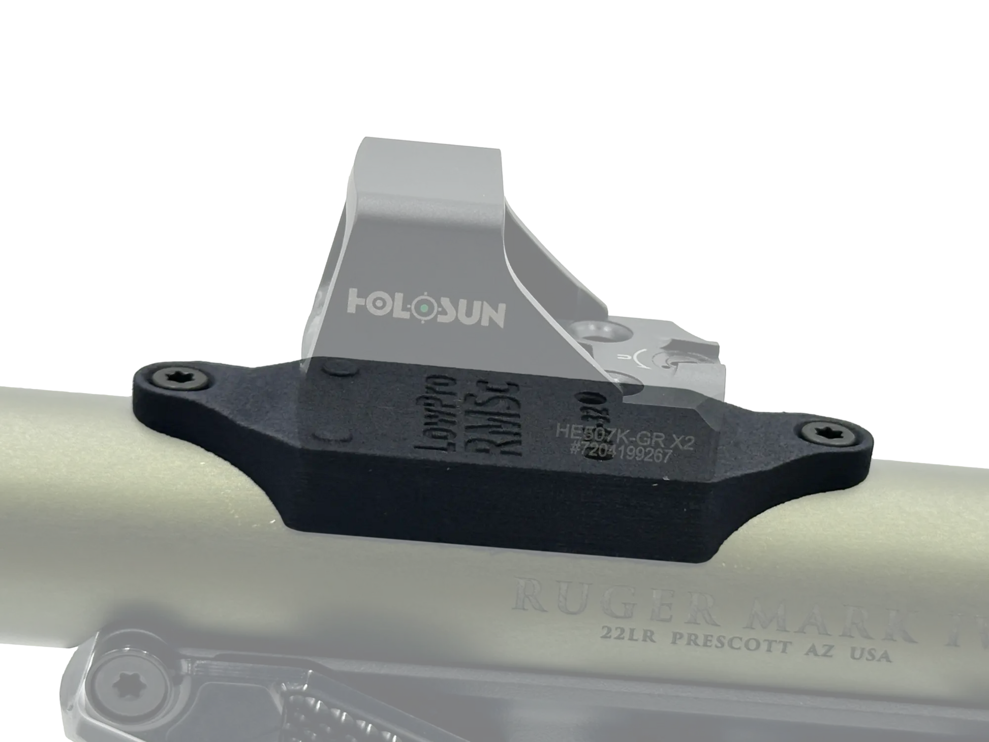 The LowPro™ Low-Profile RMSc Red Dot Mount for Ruger Mark I/II/III/IV pistols is an ultra-low-profile mounting plate for attaching a red dot with an RMSc footprint directly to the barrel of a Ruger Mark I/II/III/IV.